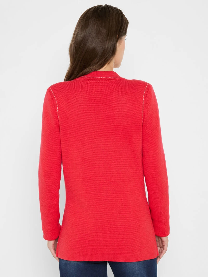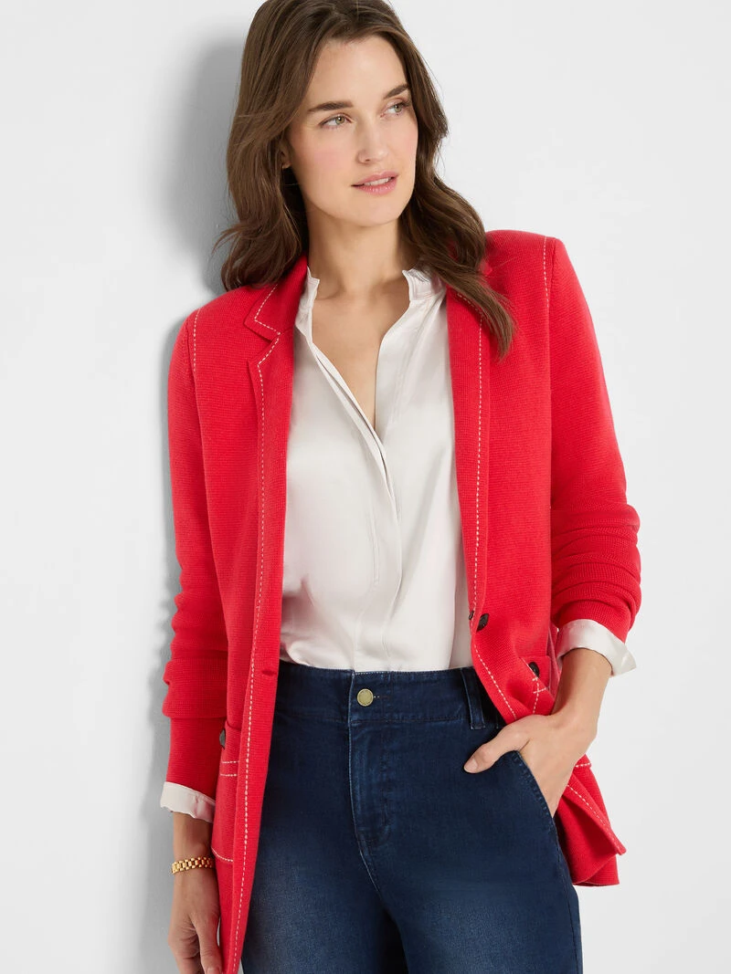 A little contrast stitching goes a long way towards creating the perfect 9-5 (or anytime) knit blazer. Crafted in a sophisticated Milano stitch that holds its shape beautifully and designed with a substantial, refined feel that won’t stretch out, she delivers the structure of a classic blazer with the comfort of a knit. Clean edges and thoughtful contrast stitching add a modern, tailored finish. Perfect for elevating your work wardrobe (and staying cozy while you’re there), it’s the versatile layer that seamlessly blends ease and elegance. Mindfully Made from fully fashioned knitwear.