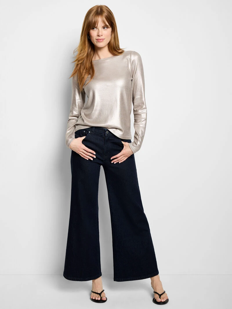 Slip into sleek sophistication with this fitted boatneck top, crafted from a soft yet structured midweight 2×2 rib that hugs your shape in all the right places. Designed with long sleeves and a hip-grazing length, it’s an elevated essential with everyday ease. Subtle glazing woven into the fabric catches the light for a hint of shine — perfect for adding polish to your denim or dressing up a tailored look. A modern staple that blends comfort, confidence, and just the right amount of shimmer.