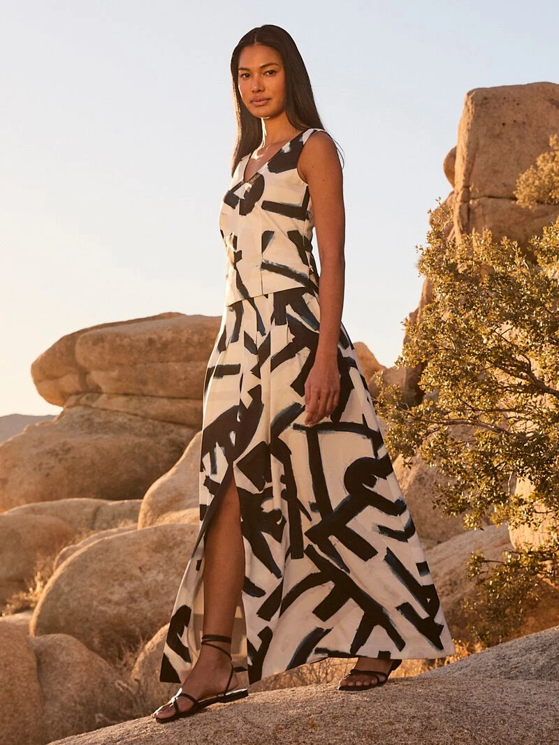 Pair it with the matching top to create a chic set, or with a plain white tee to really let the pattern pop. The shape is a feminine and elevated: a full length dramatic skirt with pleat detailing and a front slit to break up the pattern, perfect for special occasions up to and including a walk down the aisle.