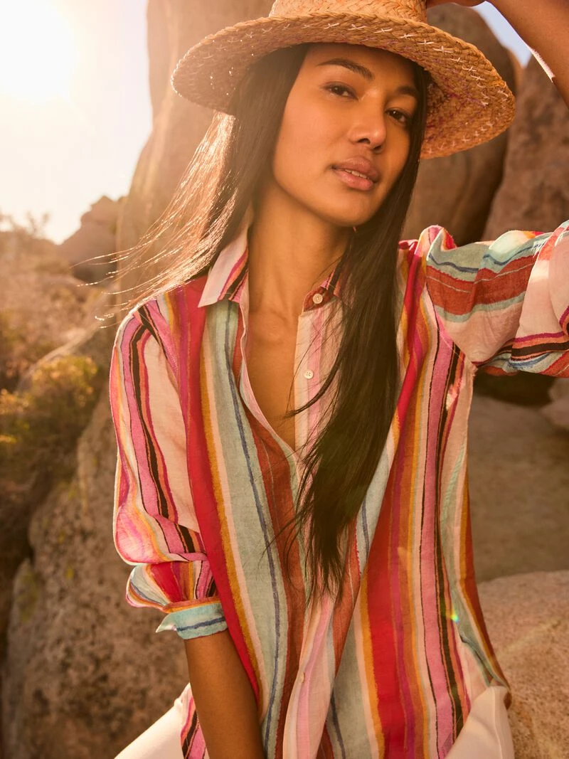 The button down that’s anything but buttoned up. The hand-painted stripe pattern gives her a bohemian, artistic look: the perfect match casual nights out, days about town, or even when you’re looking to inject some creativity into your office routine. The easy-fitting silhouette was made to match, with an abbreviated 3/4 sleeve and hem that extends slightly below the hip. Mindfully Made from drapey LENZING Tencel, featuring fibers made from wood pulp harvested from sustainably managed forests.
