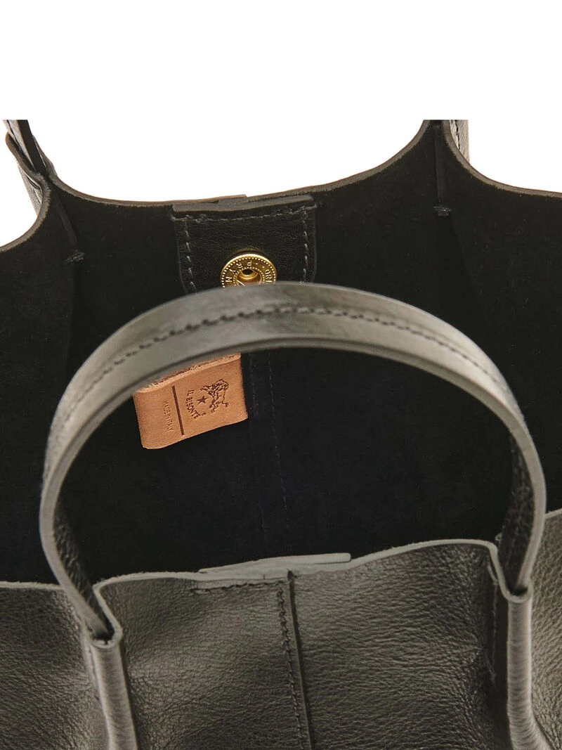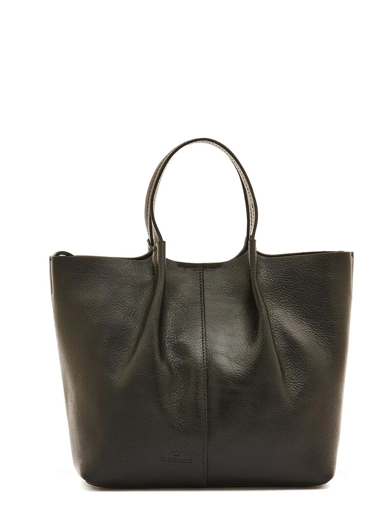 Small tote bag with an essential, timeless design defined by supple vegetable-tanned leather and soft pleats. Shoulder strap can be adjusted with stud. Pleats hand-stitched in place. Snap button closure. Lined in suede. 100% made in Italy.