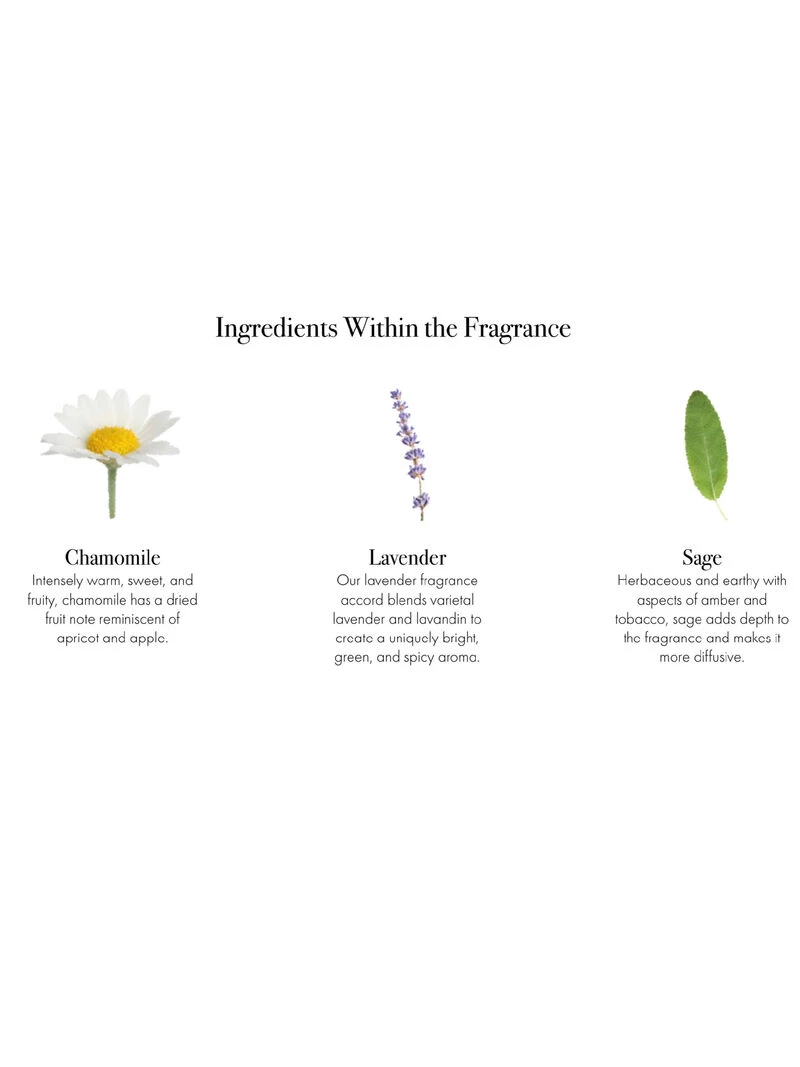 Fresh sheets beckon. On the nightstand a sprig of lavender melds beautifully with warm and enveloping bergamot. Calming chamomile melts into a heart of eucalyptus to create a feeling of well-being. Smoky patchouli is enhanced by hints of sage and rosemary for a quiet, relaxing finish.