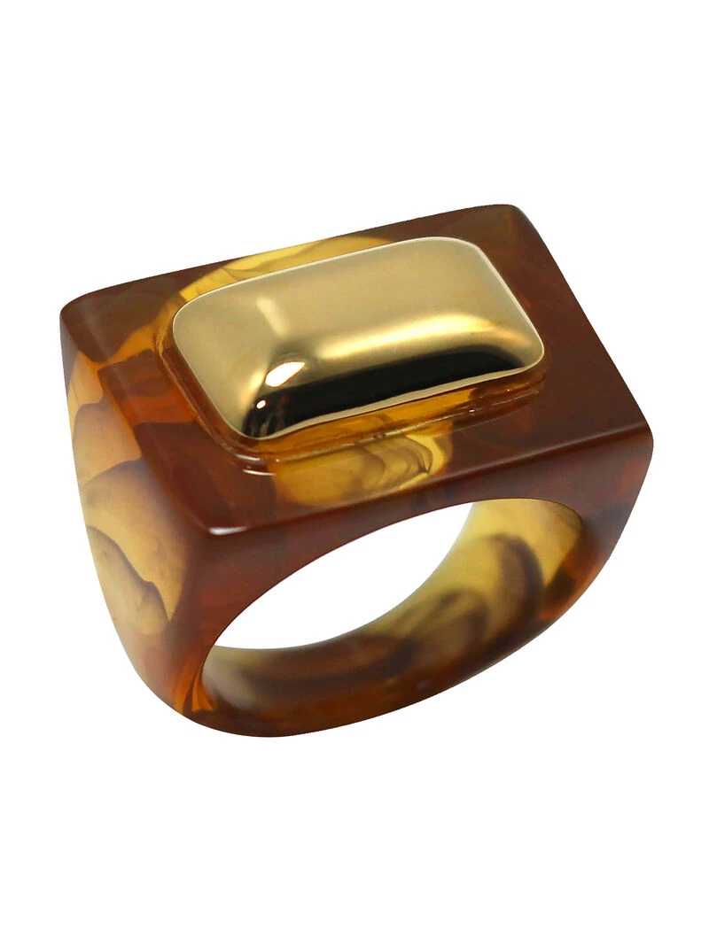 Tortoise shell colored resin ring with rectangular 18K gold-plated stone.