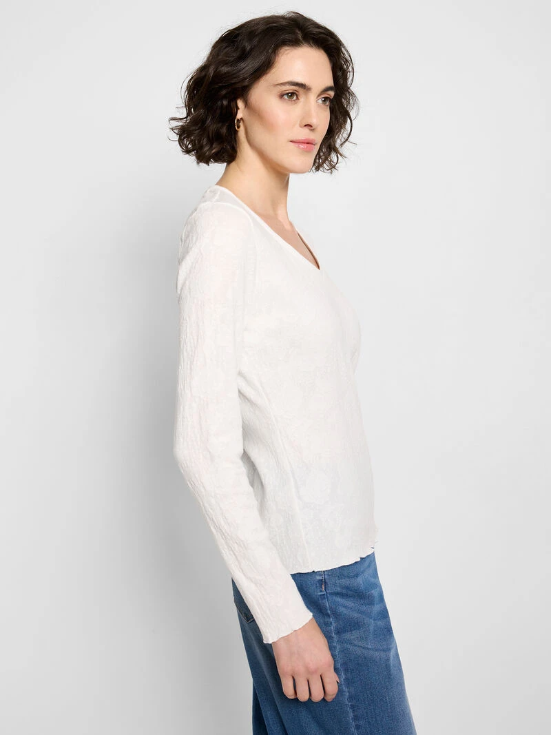 The Lace Knit Tee: now available in a V-neck. As with the crew neck version, it’s the details that make the difference in this top that combines the classic ease of a long-sleeved tee with the elegant detailing of lace. Lettuce detailing along the edge of the stretch lace fabric adds feminine texture to the iconic silhouette. Pull-on with a classic V-neck, perfect as a capable base layer or the perfect partner to your favorite pair of jeans.