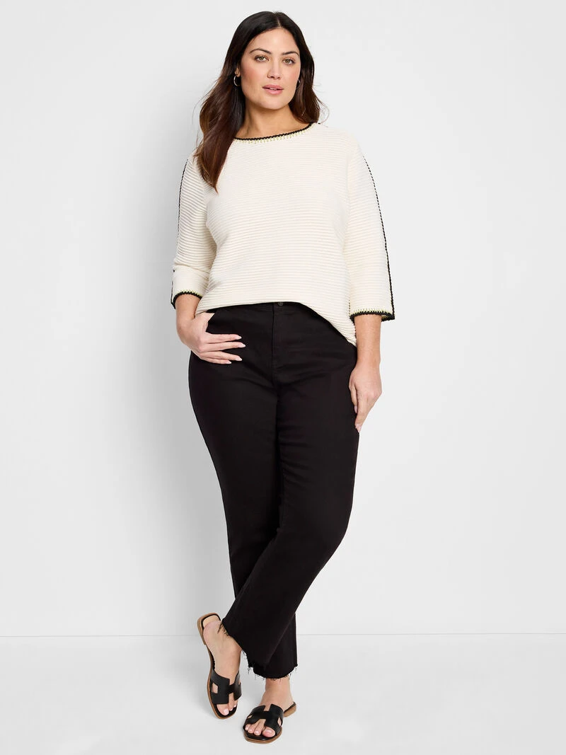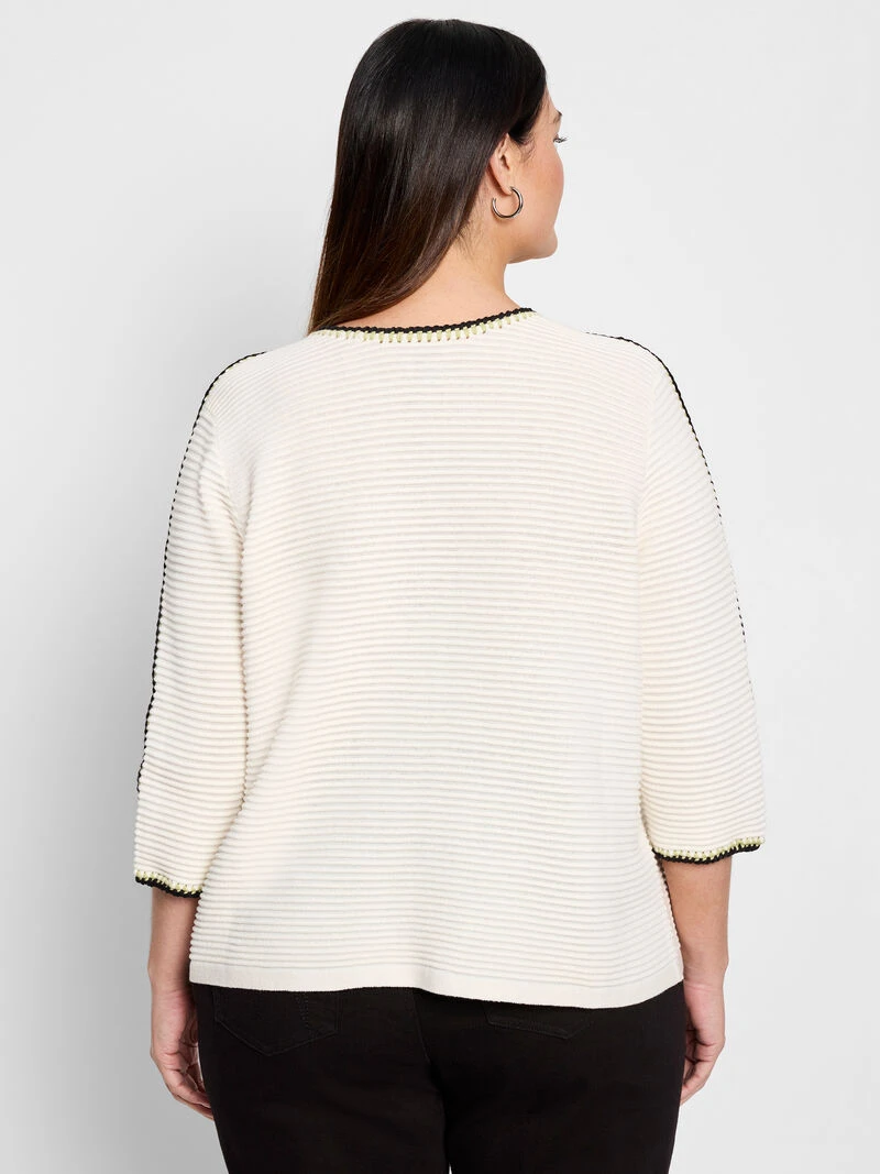 Where technical brilliance and knitwear expertise meets traditional artistry. Inspired by traditional Ottoman stitching that produces a robust ribbed texture, our take is on the softer side while maintaining more solid feel. We also added blanket stitch detailing in two different yarns along the neckline and sleeve. Great with denim or the office. Mindfully Made from fully fashioned knitwear that eliminates textile waste.