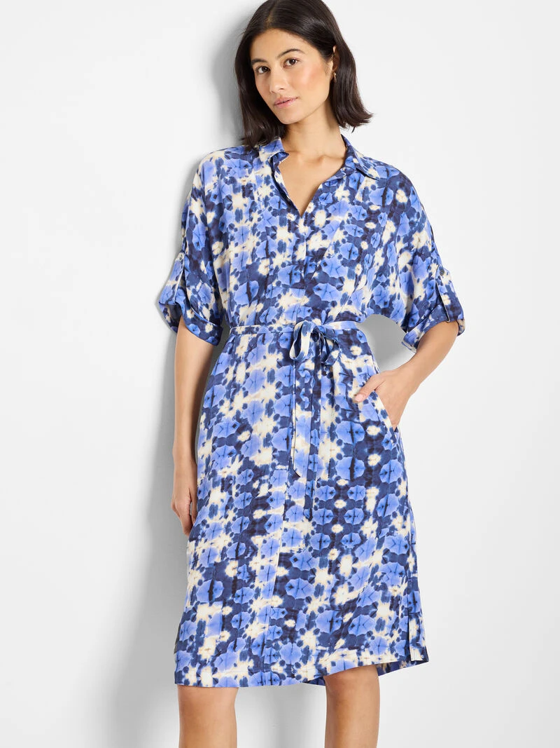 The Devon silhouette plus a few utility-minded tweaks like the side tab and the removable self tie belt. Still beloved for her ease and commitment to chic vintage style. This version features a print inspired by the Japanese art of Shibori dyeing. With short sleeves, a shirt collar and a hem that falls at the knee. Pockets, too! Made from a new soft and drapey viscose and crepe fabric so it feels as good as it looks.