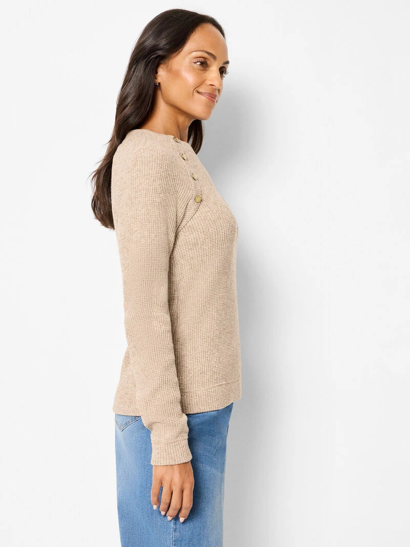 The ease of a tee with the textured look of a sweater, this chic top is the best of both worlds, perfect for dressing up or down. The button detailing at the shoulder lifts the look while the thermal waffle knit construction keeps things cozy. With raglan sleeves to create extra shape.