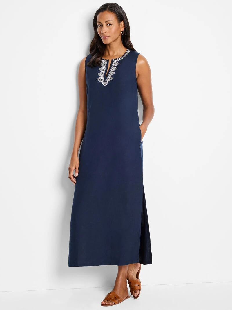Designed for life lived al fresco, it’s the polished warm weather piece your wardrobe has been missing. Full length and in a breathable linen blend, she features beautiful embroidery around the split collar reminiscent of classic bohemian style. With pockets and an A-line shape, she’s as functional and easy as she is gorgeous.
