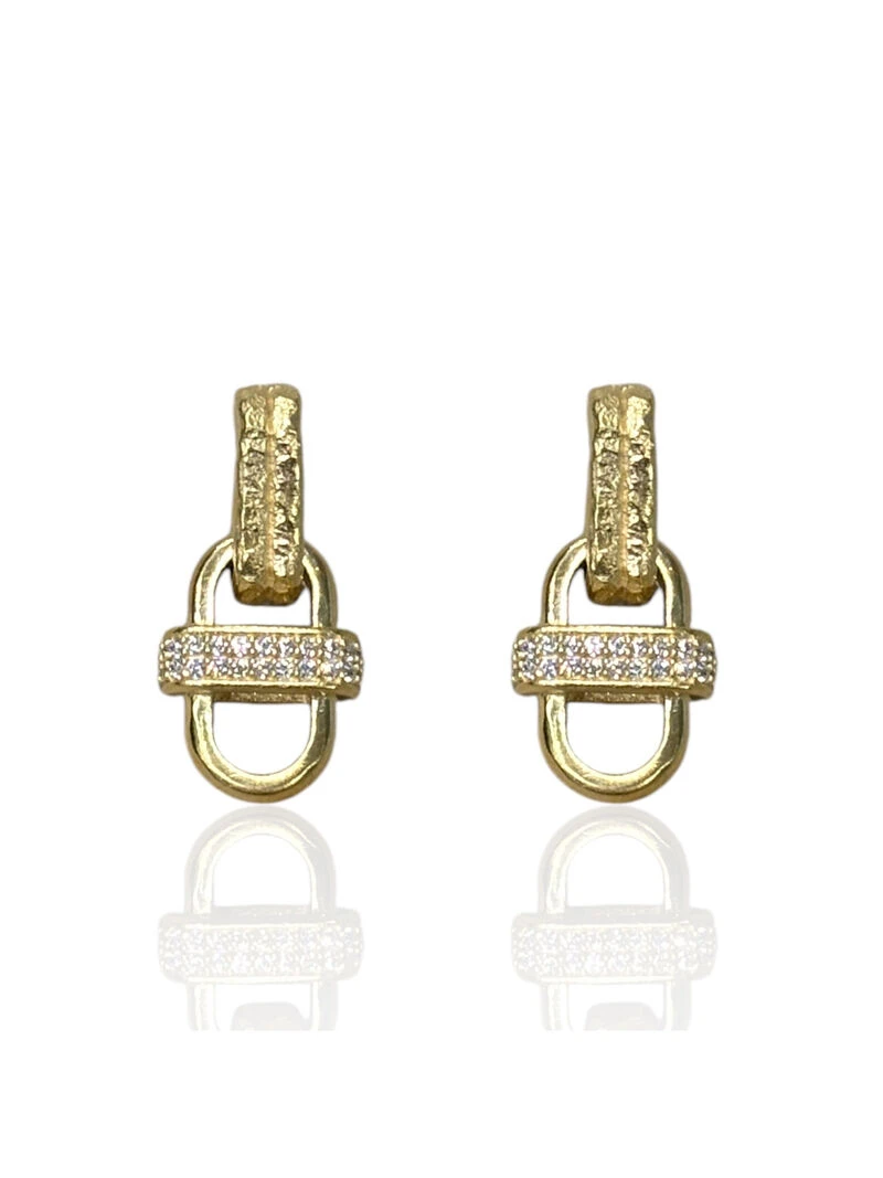 These elegant earrings showcase a refined 14K gold-plated finish with hammered detailing for added texture and shine. Two delicate rows of pavé cubic zirconia offers a subtle sparkle, enhancing their sophisticated design. Measuring 7/8″ in total length, they’re the perfect lightweight statement. Finished with a custom logo silicon center back, these earrings stay comfortably and securely in place all day.